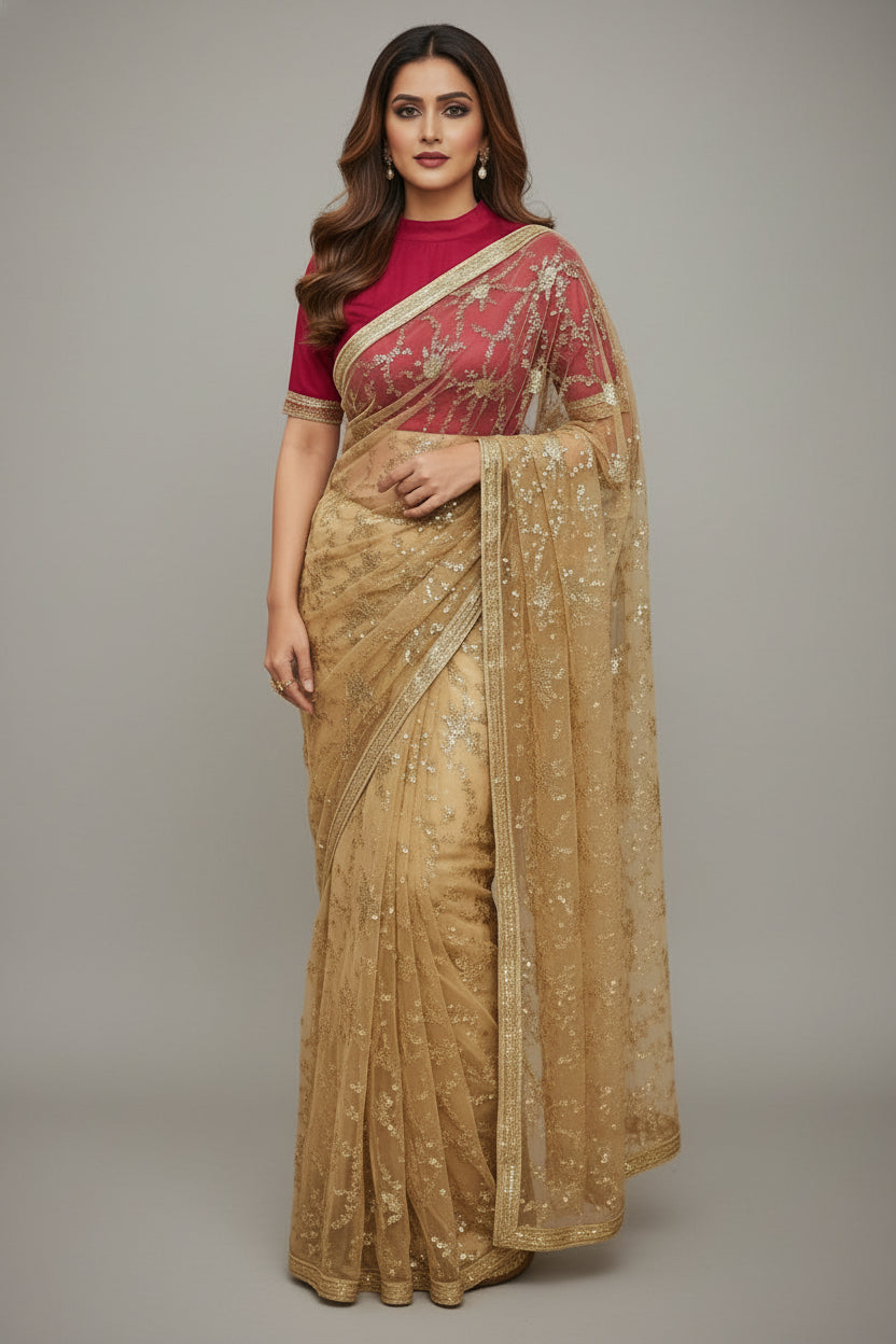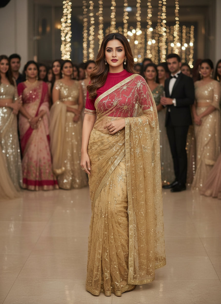 This Designer Net Saree is sure to make a statement. The butterfly net fabric and all over sequins work is beautifully complemented by the rich embroidered work , giving a luxurious look. Make this stunning piece yours and stand out in the crowd