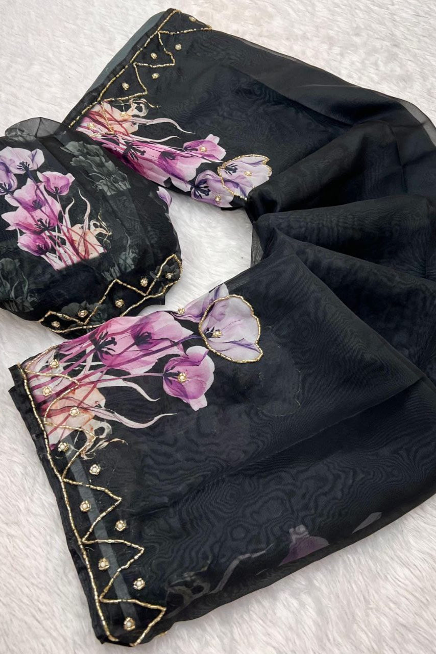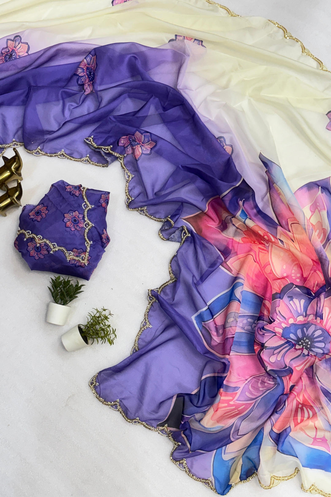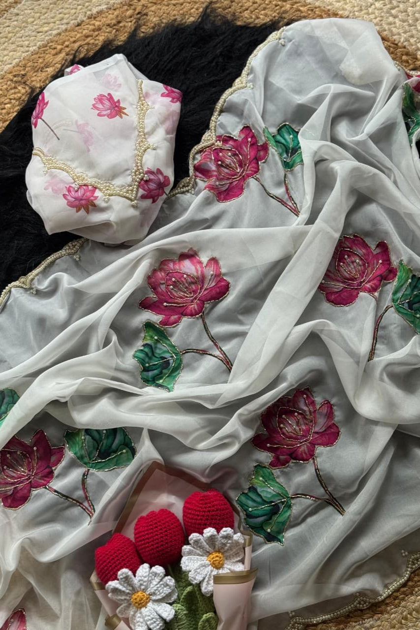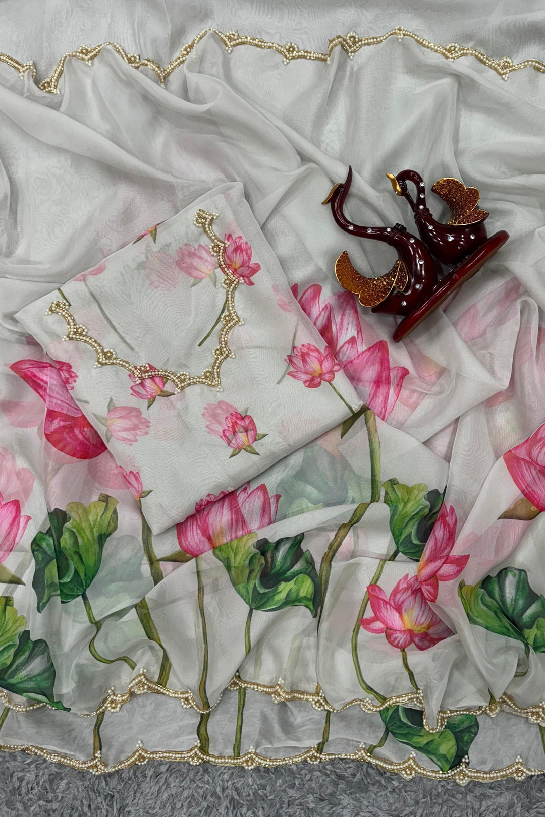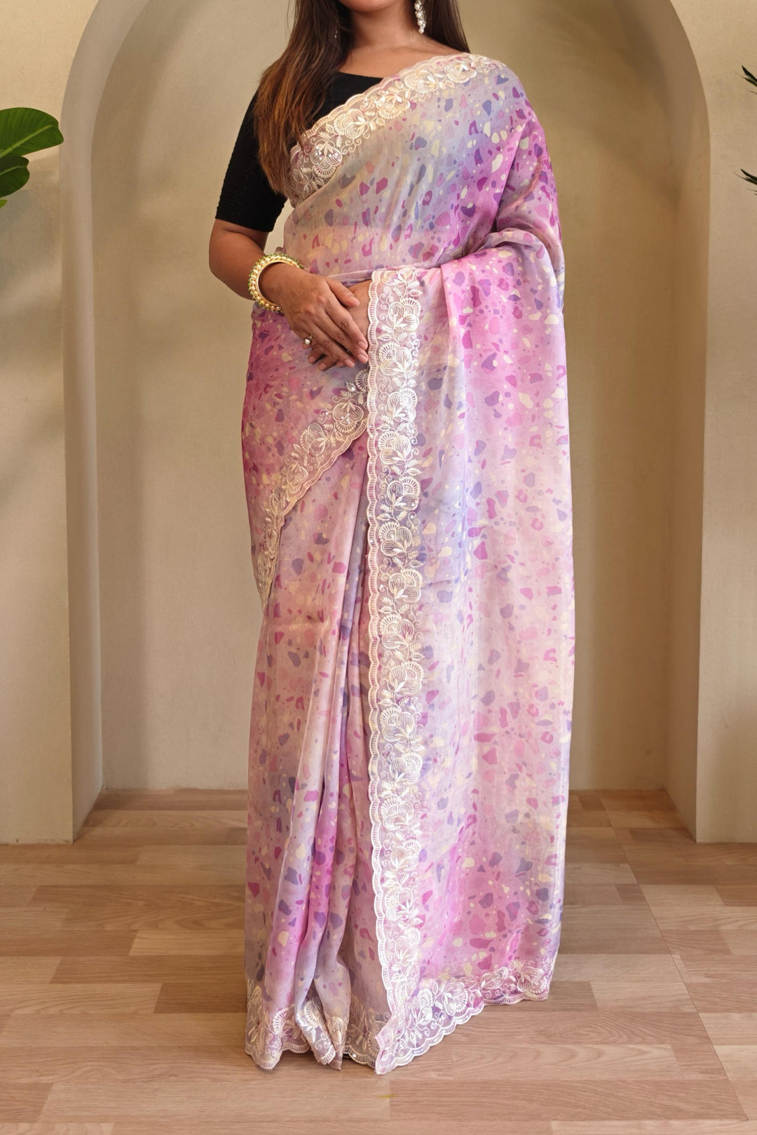 Printed organza is a type of organza saree which is widely accepted by women to slay the look at parties and festivals. The Printed Organza saree has delicate floral prints along with geometric designs and the presence of motifs.
