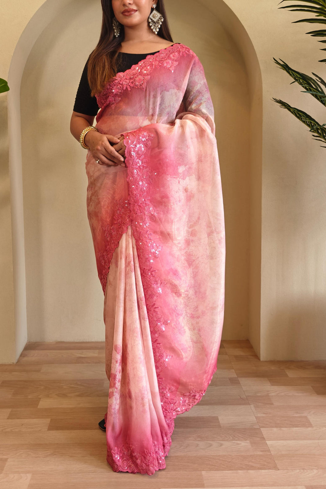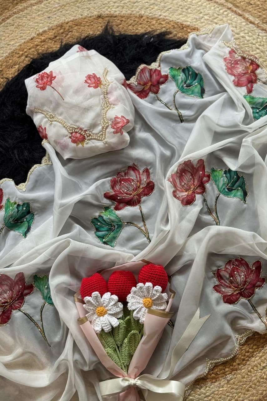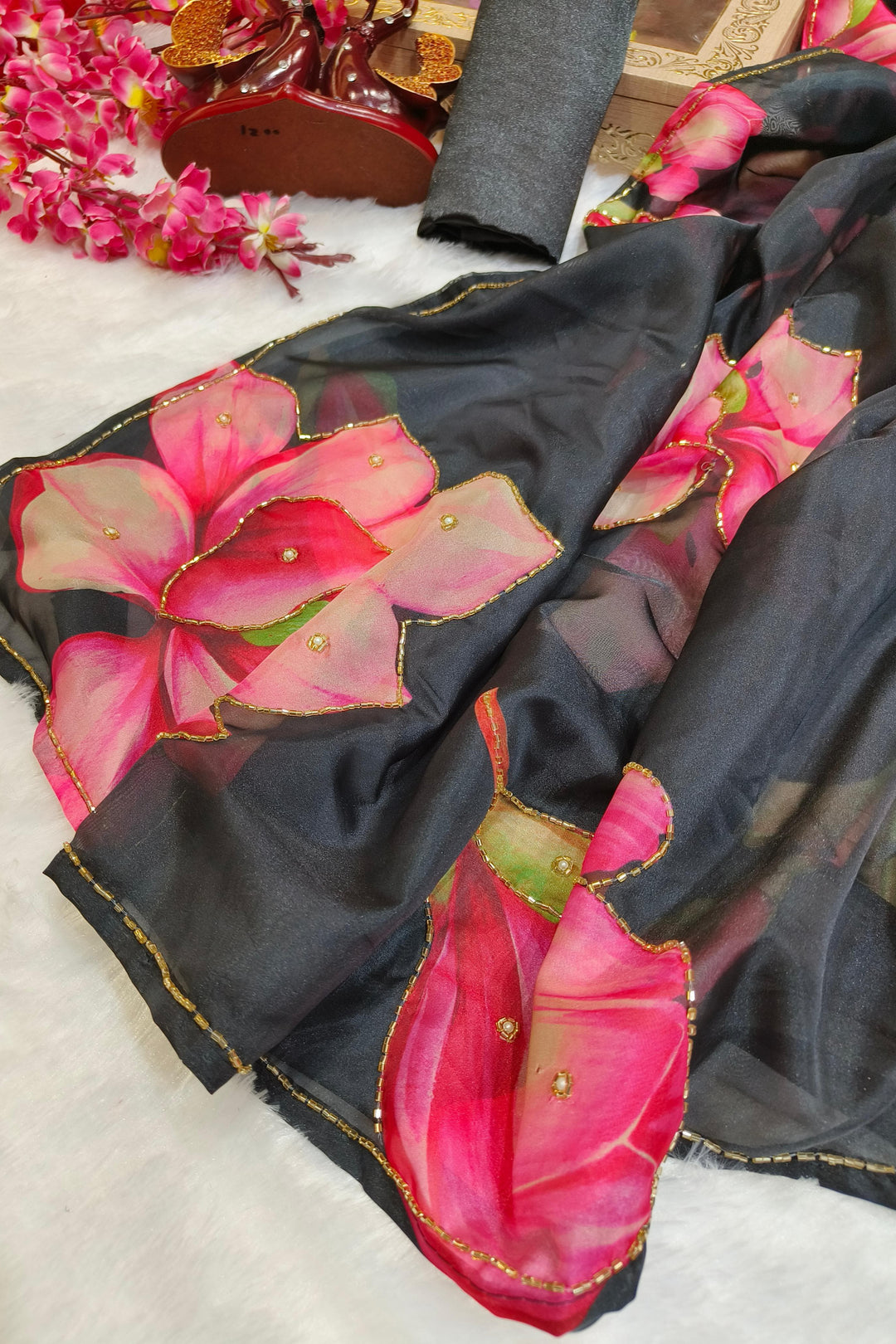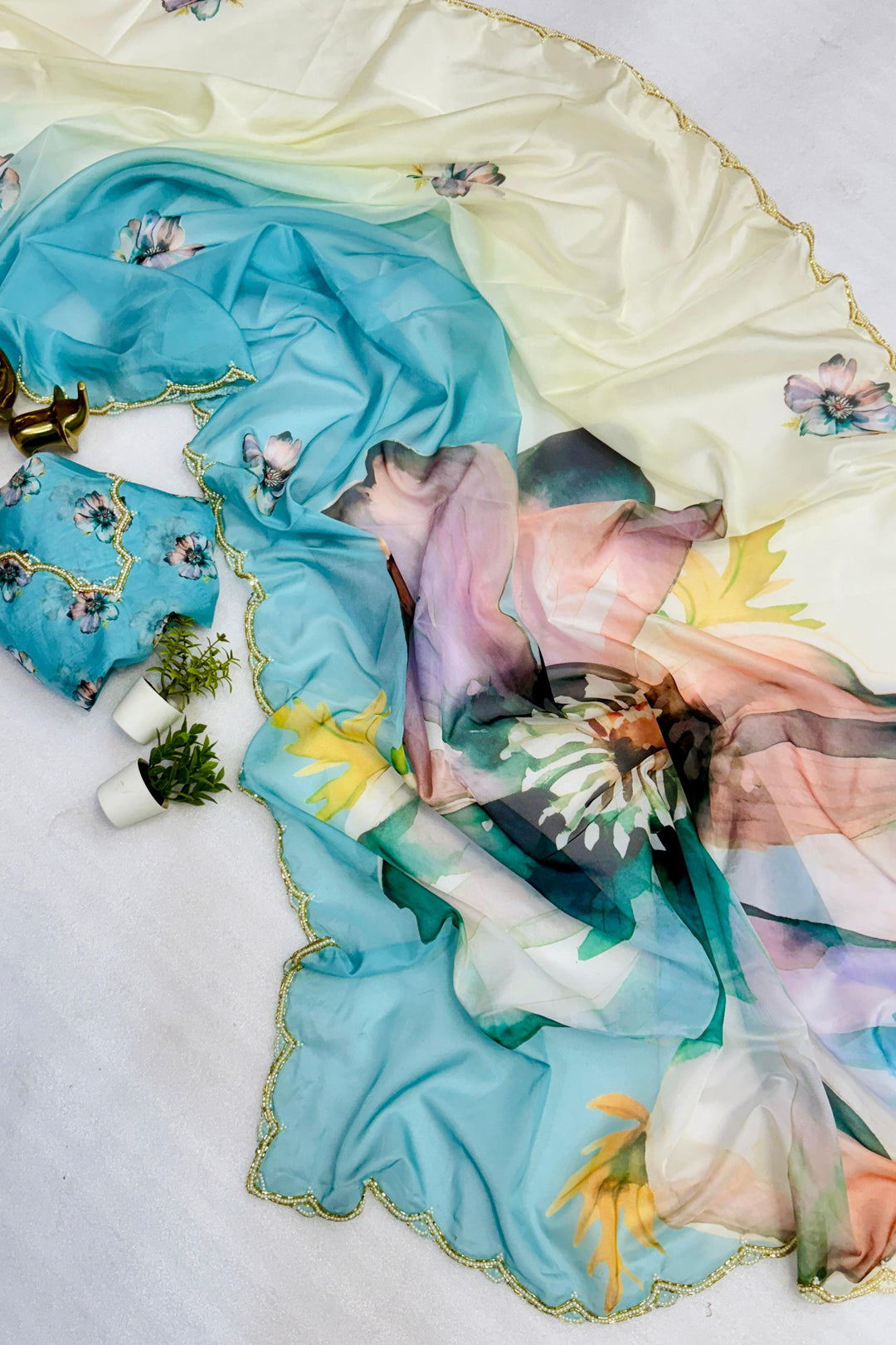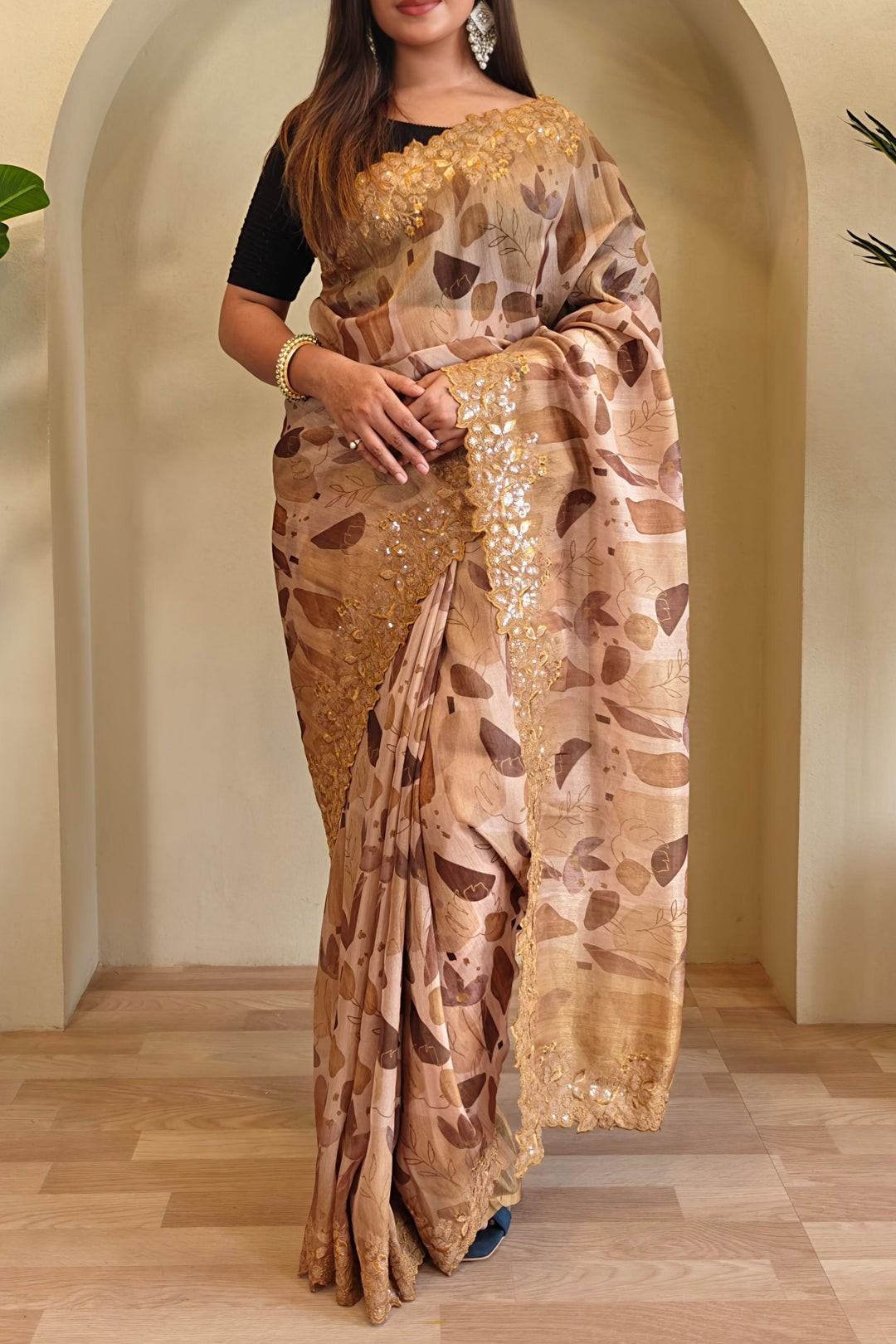 Printed organza is a type of organza saree which is widely accepted by women to slay the look at parties and festivals. The Printed Organza saree has delicate floral prints along with geometric designs and the presence of motifs.