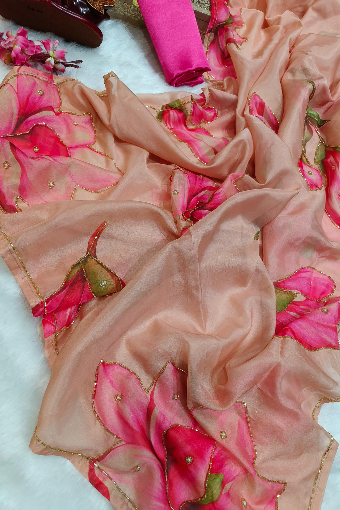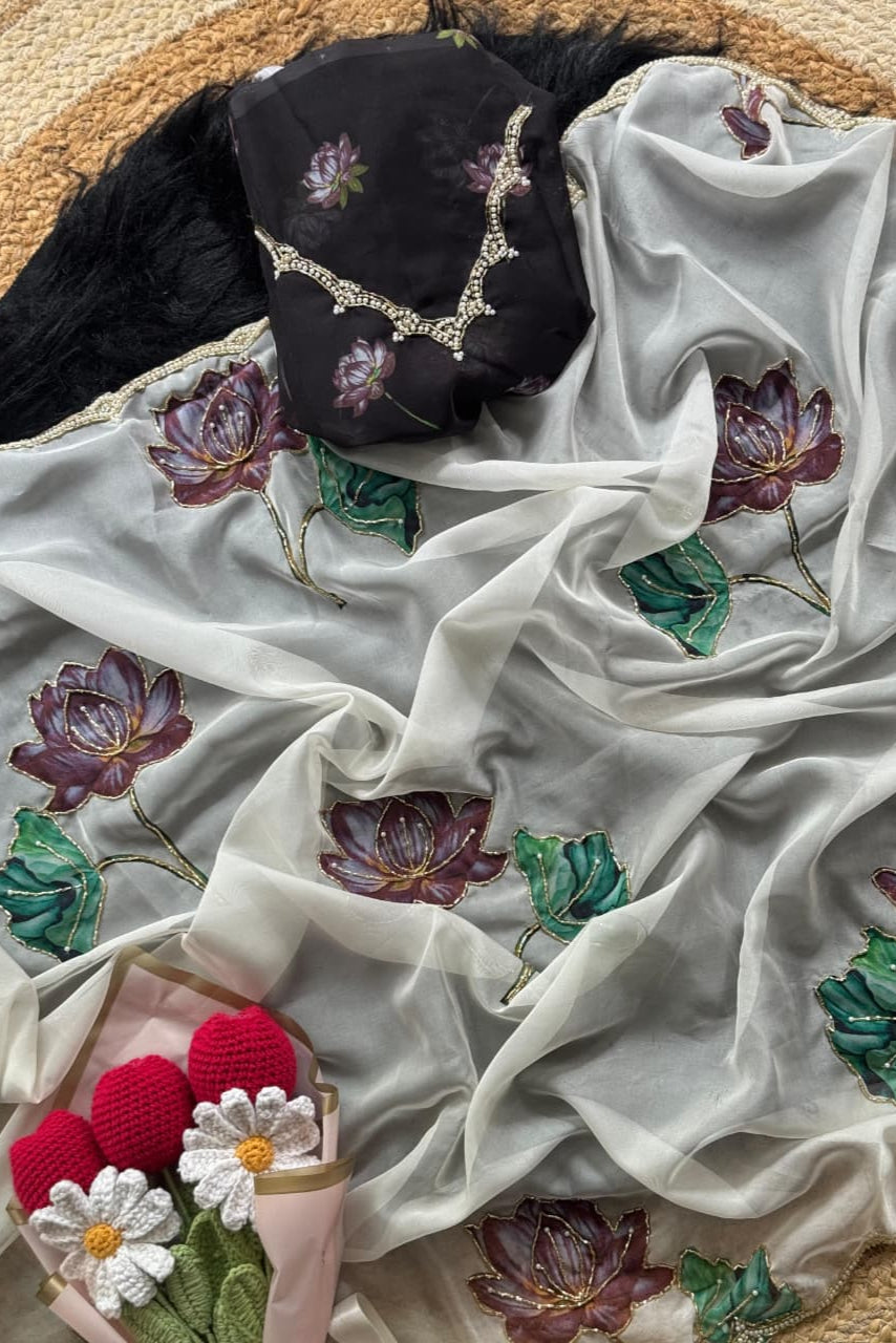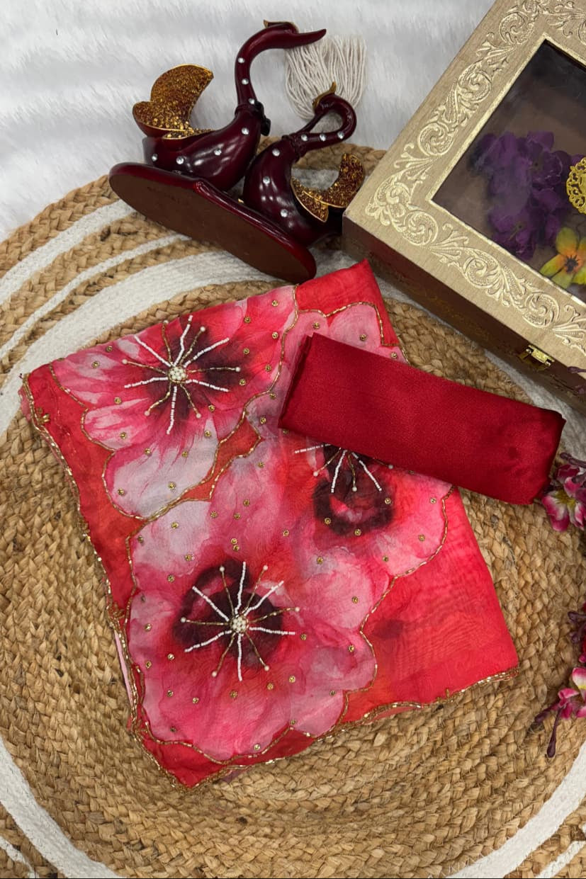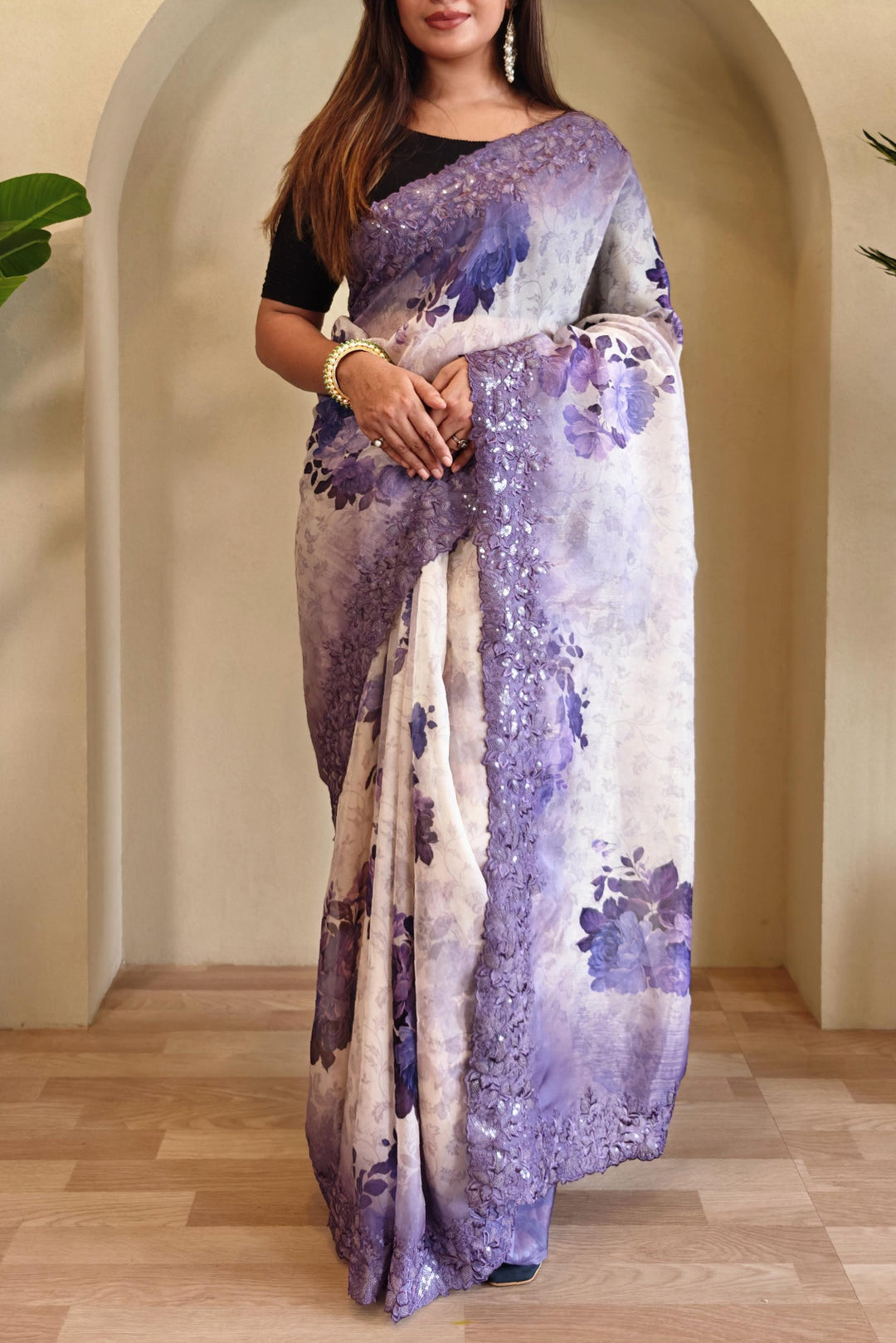 Printed organza is a type of organza saree which is widely accepted by women to slay the look at parties and festivals. The Printed Organza saree has delicate floral prints along with geometric designs and the presence of motifs.