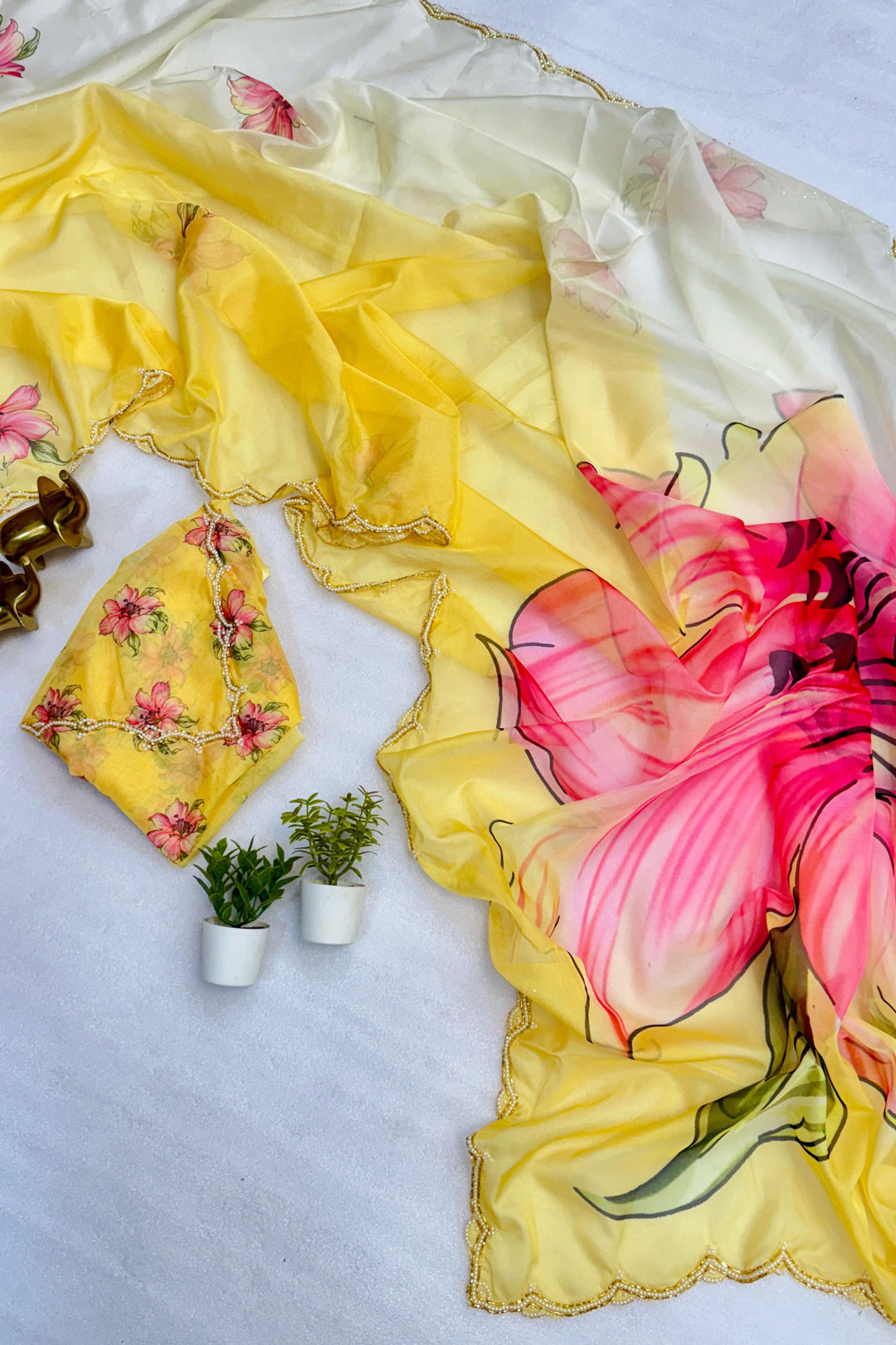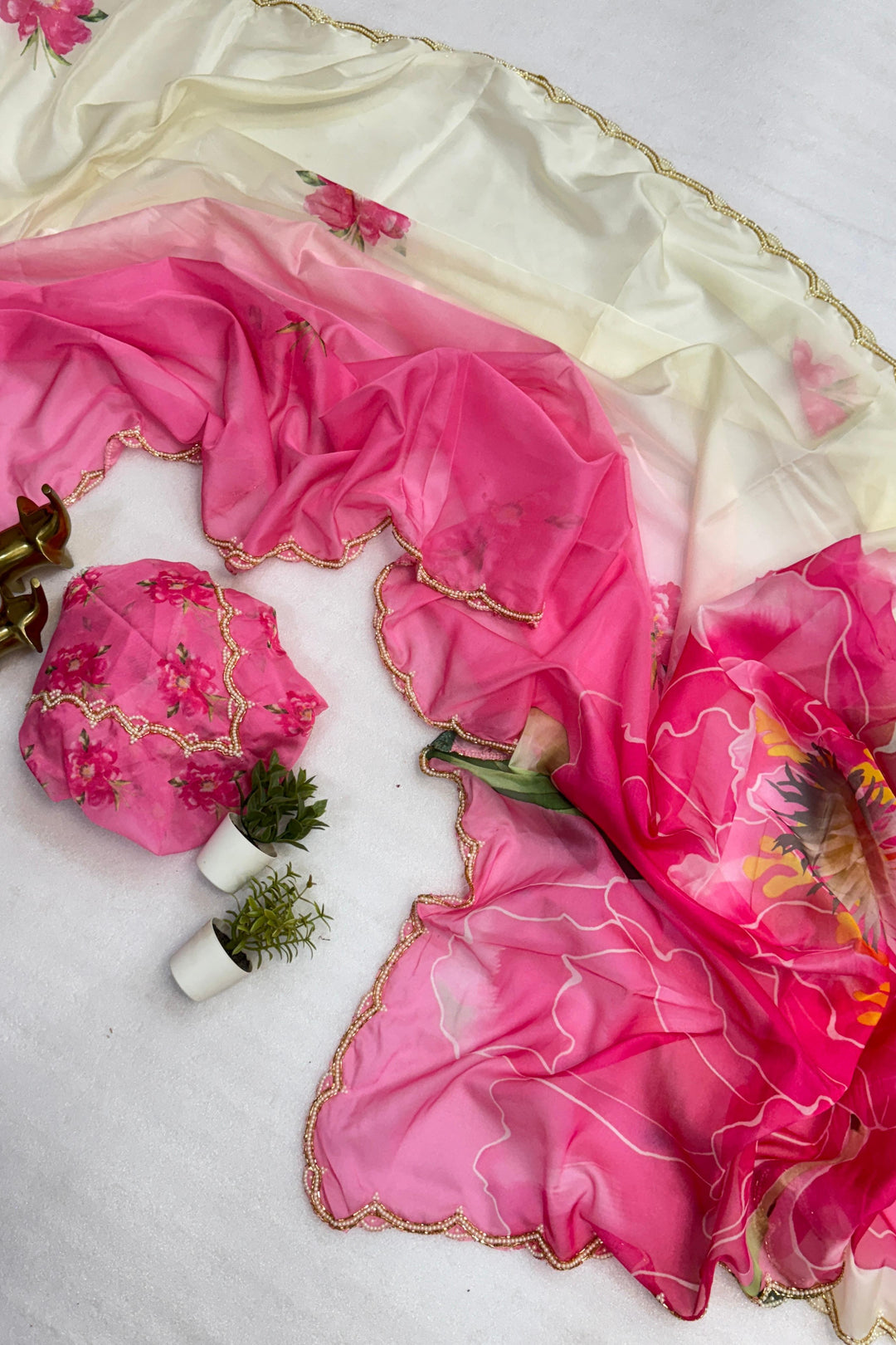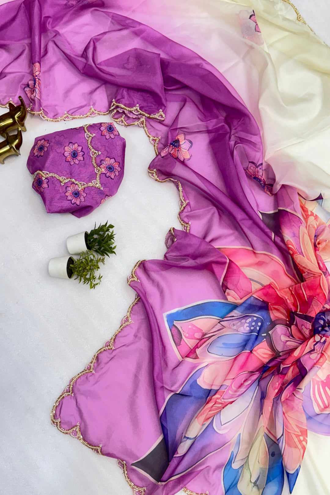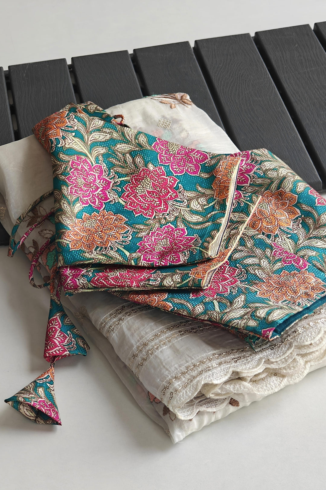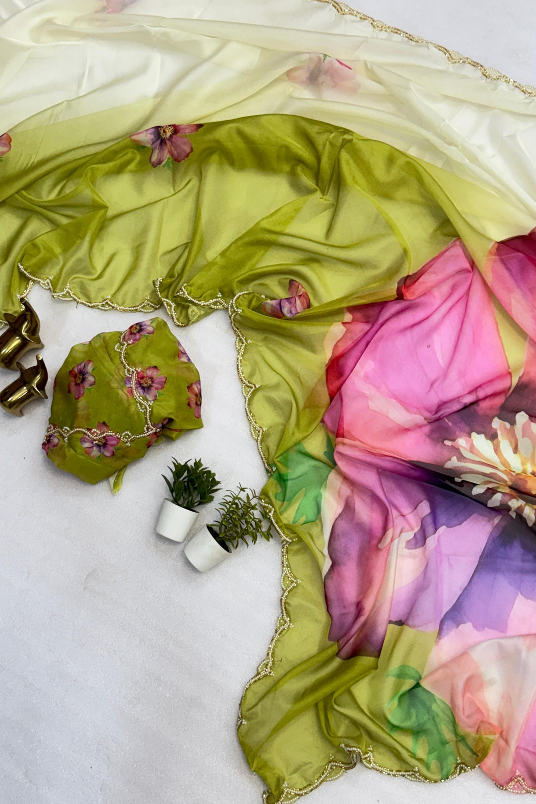 Printed organza is a type of organza saree which is widely accepted by women to slay the look at parties and festivals. The Printed Organza saree has delicate floral prints along with geometric designs and the presence of motifs.