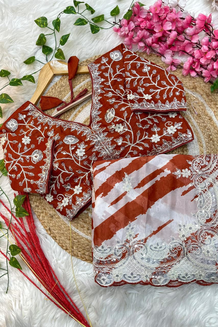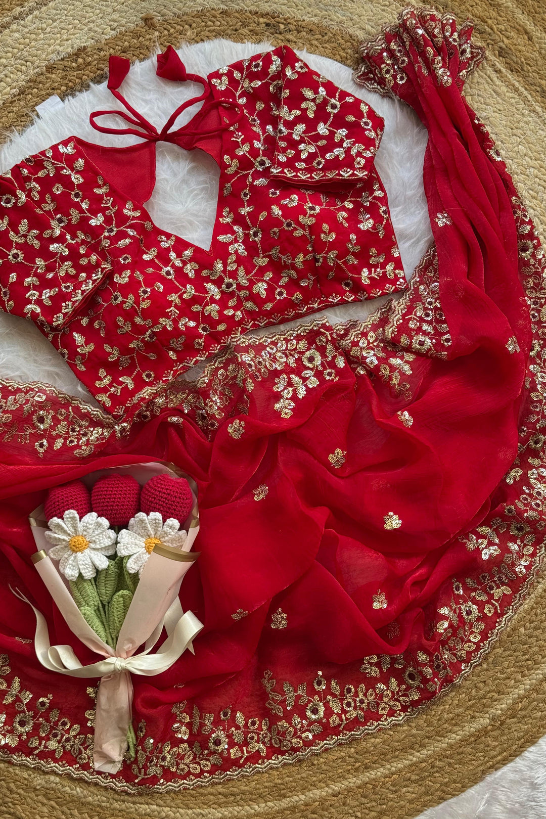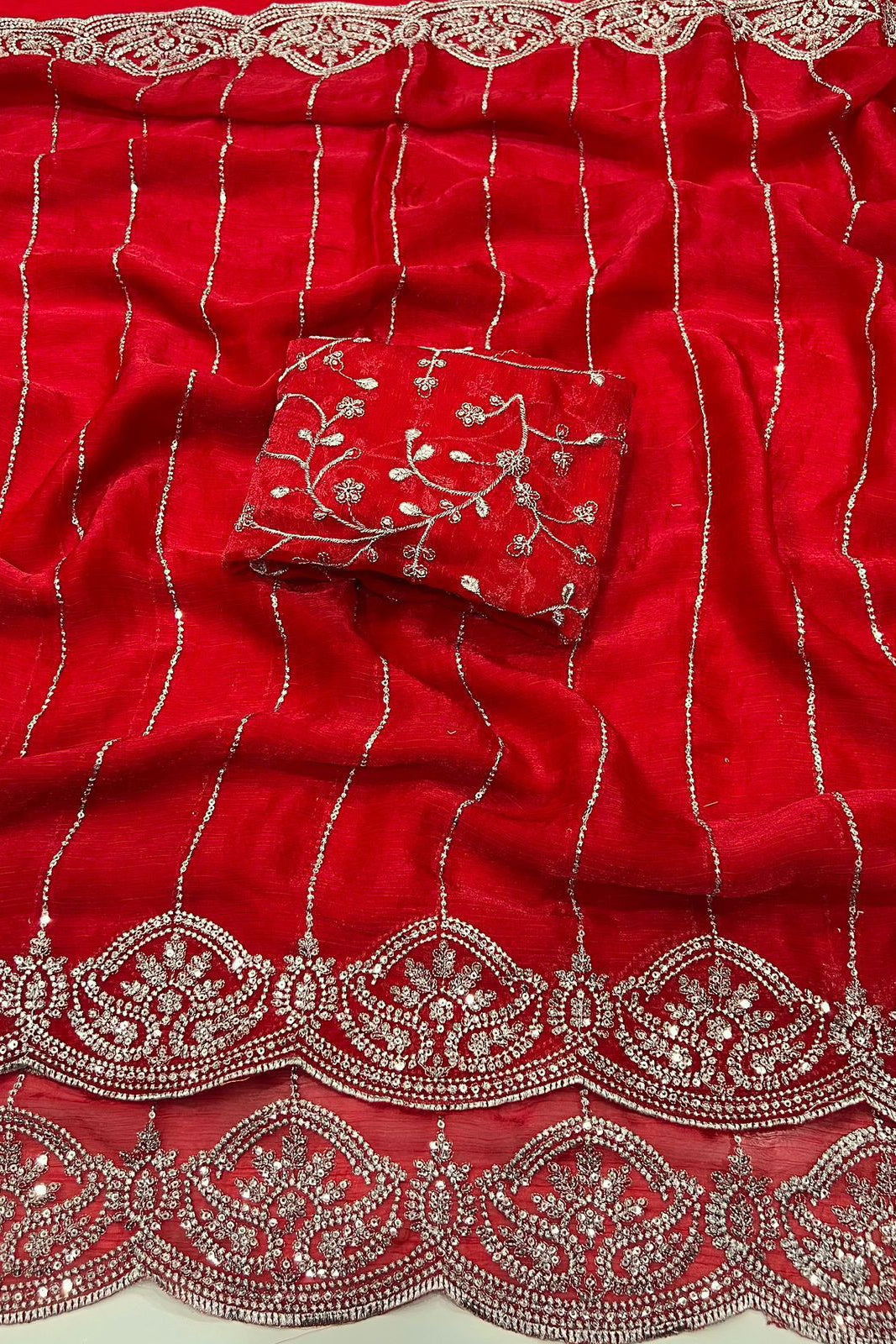 Red Kesar Georgette Partywear Silk Saree [ Dupatta With Unstitched Blouse]