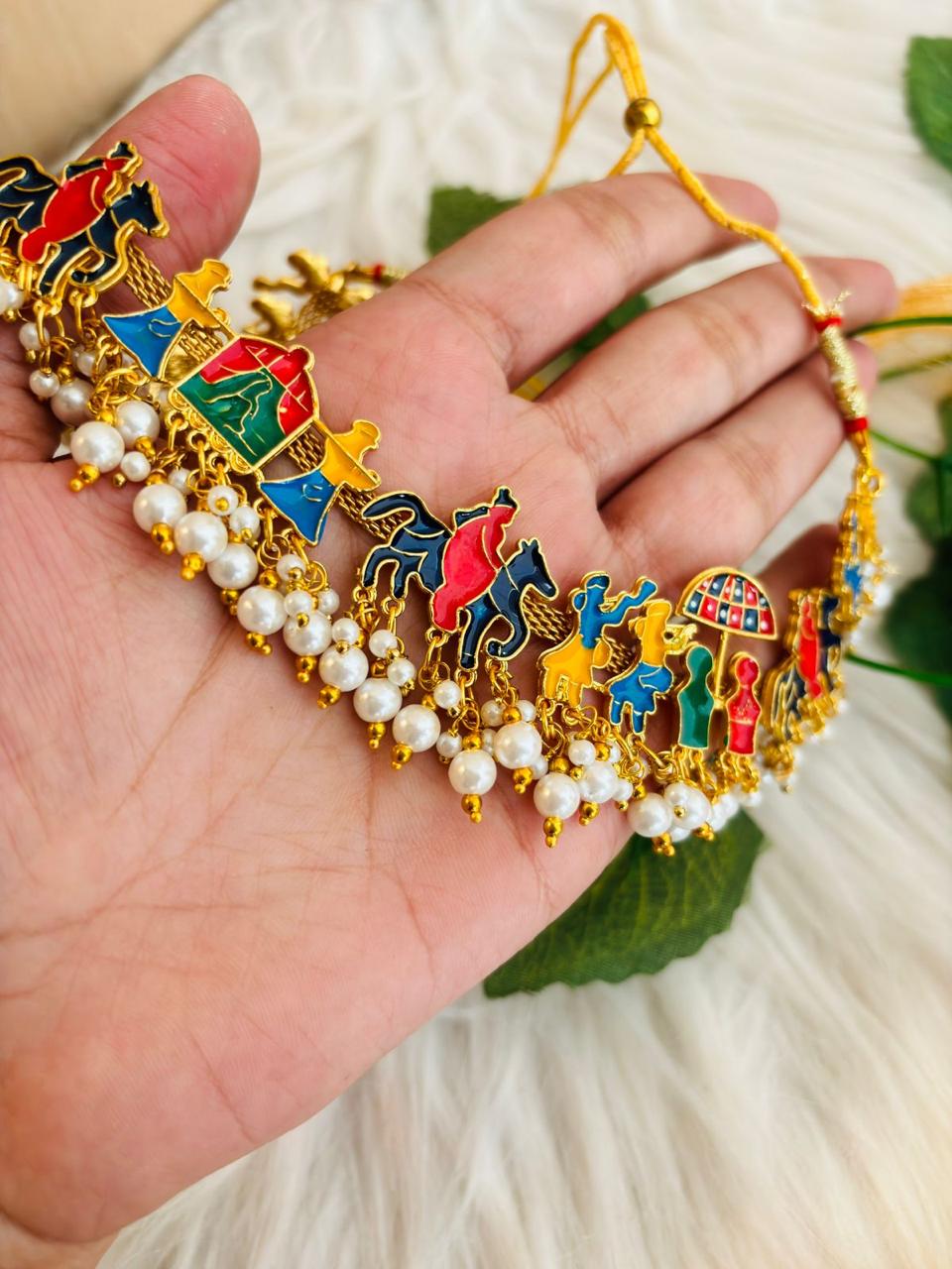 Unleash your style potential with the Gold Plated Collection, featuring a chic glossy finish and a one-of-a-kind design. This set includes a designer 1p heavy necklace, this is  plated with luxurious golden color with meenakari work. Elevate your fashion game now!
