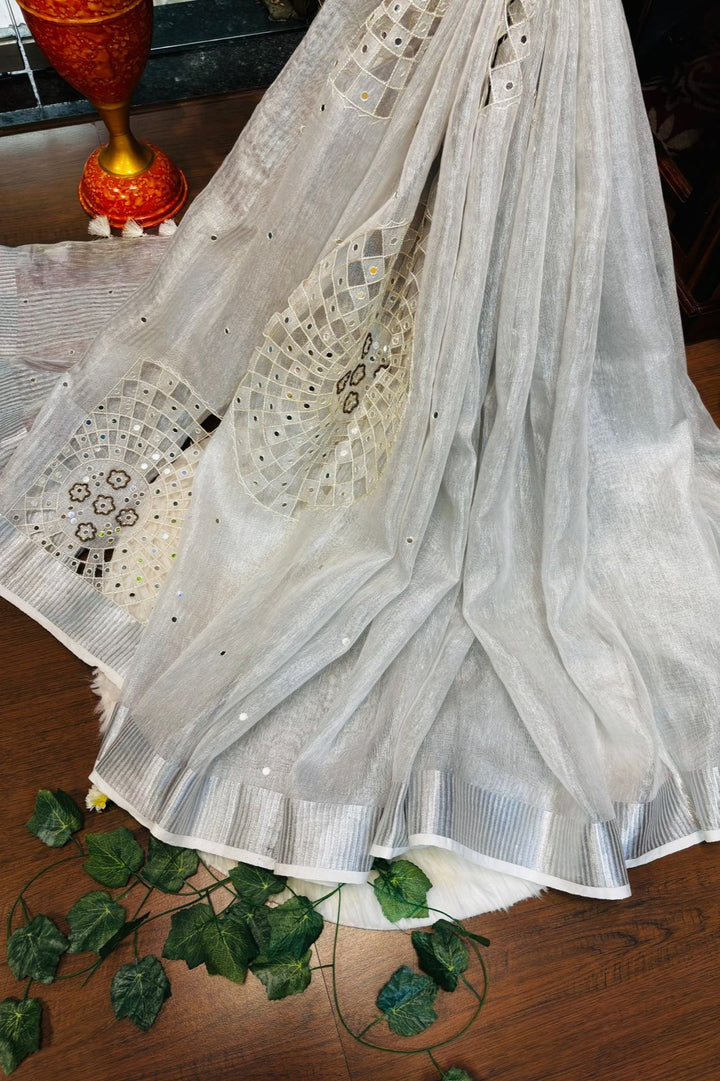 - Premium Quality Handwoven Silver Tissue Linen Saree.