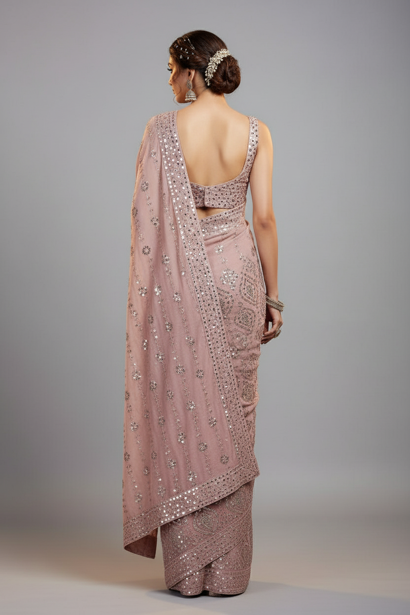 Elevate your elegance with this luxurious Georgette Saree, designed to shine at any special occasion. Crafted from soft, flowing georgette (Semi)fabric, this saree offers a light, comfortable drape while ensuring you exude grace and sophistication. The saree is adorned with big sequins work and Embroidery all over, creating a dazzling, radiant effect that glimmers as you move, making it the ideal choice for party wear and evening events.