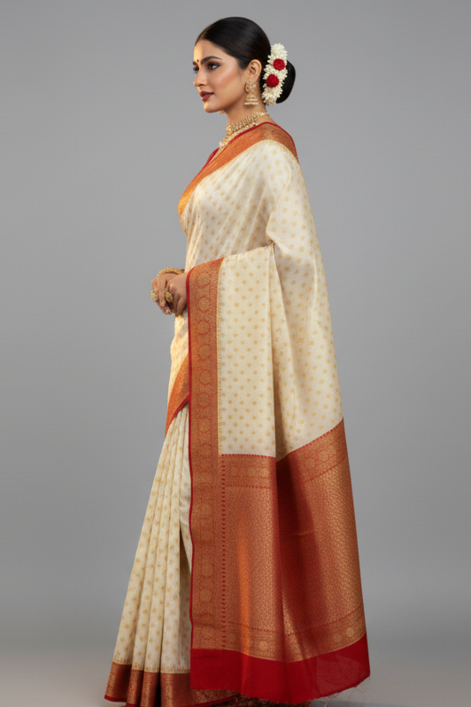 Look stunning in this beautiful white and red Banarasi Semi Georgette and Soft Silk saree for any puja or sacred occasion. This traditional combination has subtle elegance and modern allure! Be ready to shine in this gorgeous look!