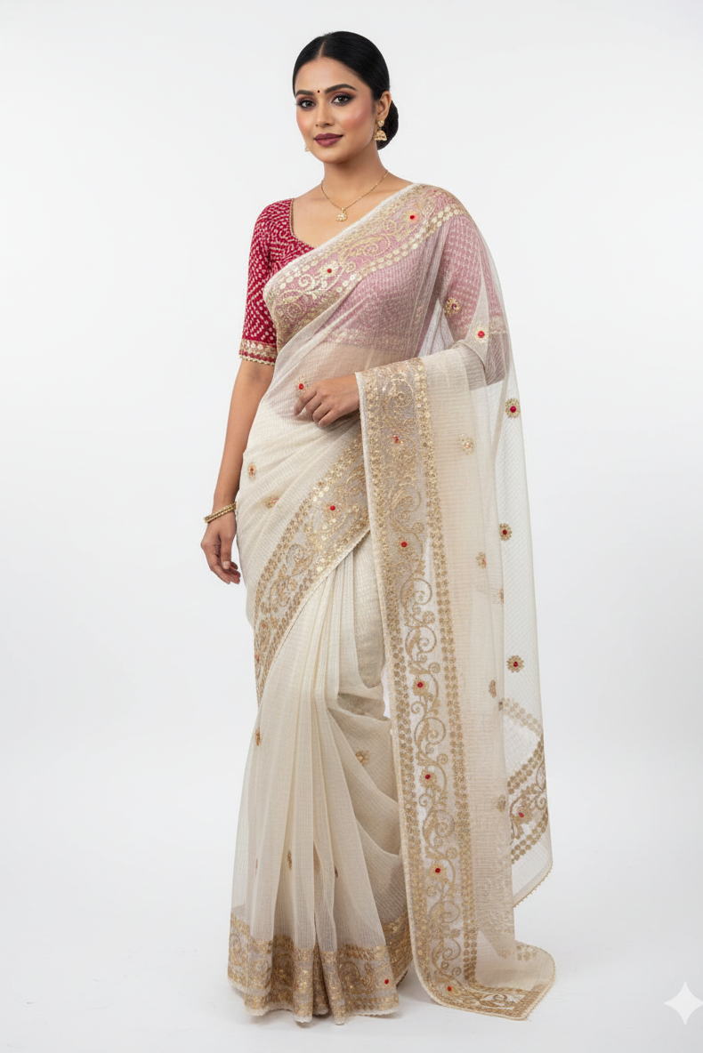 Delicate Floral Touches: Subtle red and gold embroidered motifs scattered across the saree give it a charming, handcrafted finish.