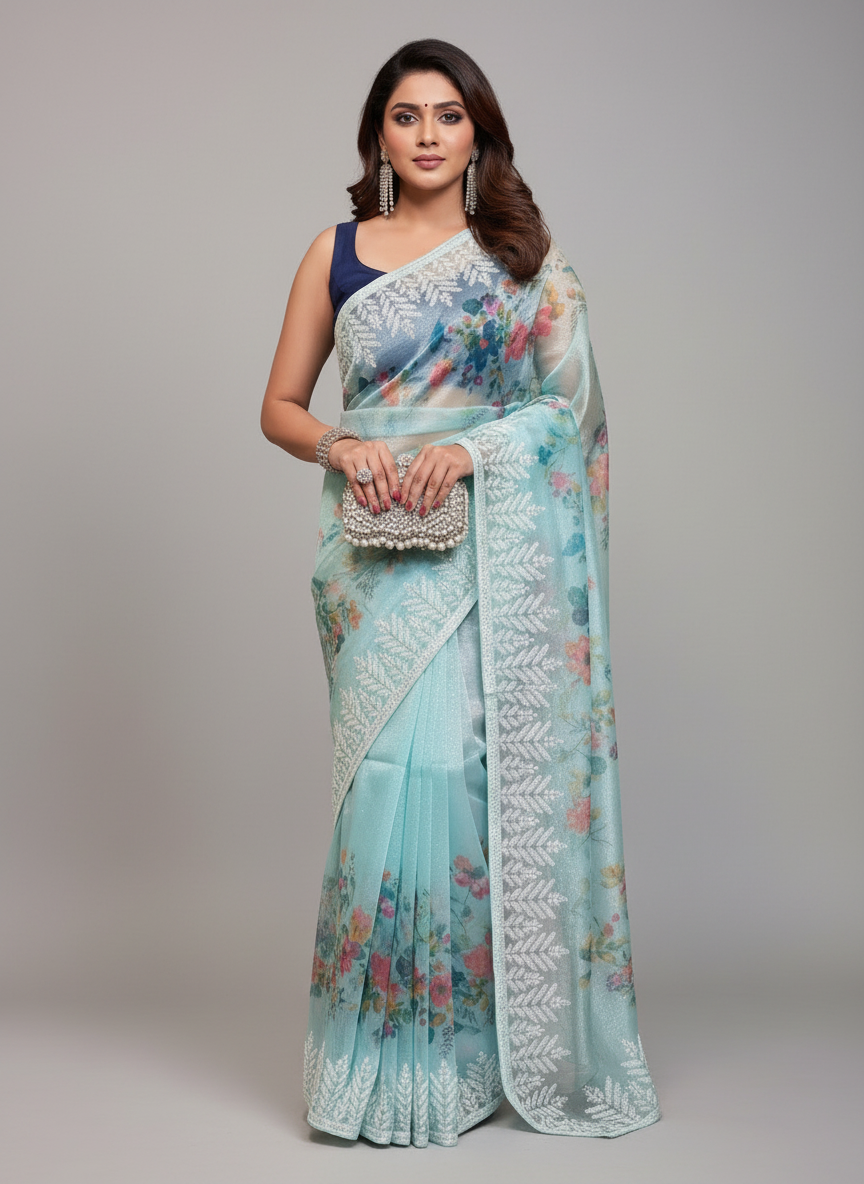 Grace your wardrobe with the Organza (blended)Saree, a perfect blend of modern artistry and traditional charm. 🌸✨
