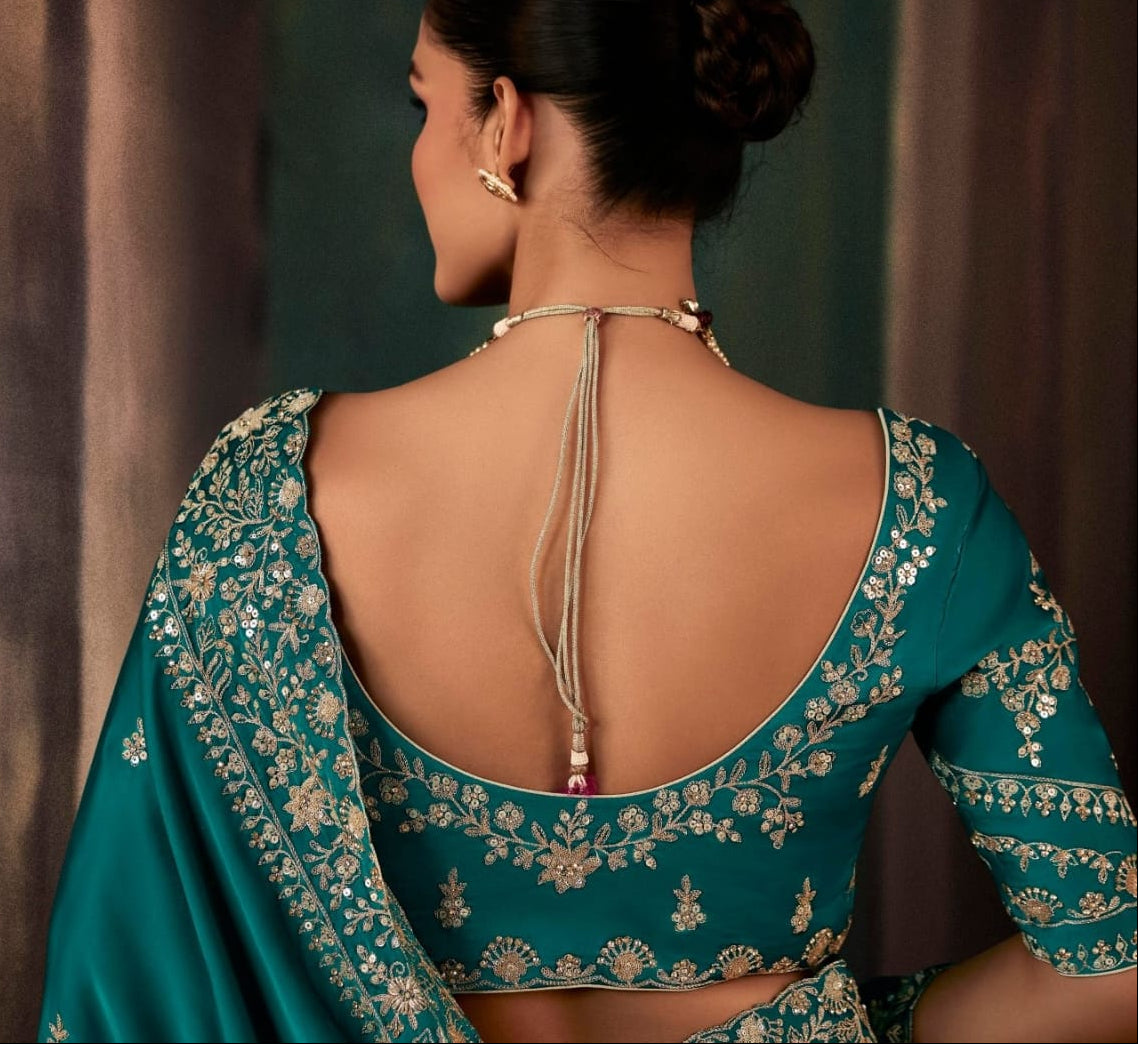 This fancy silk saree has all over embroidery style