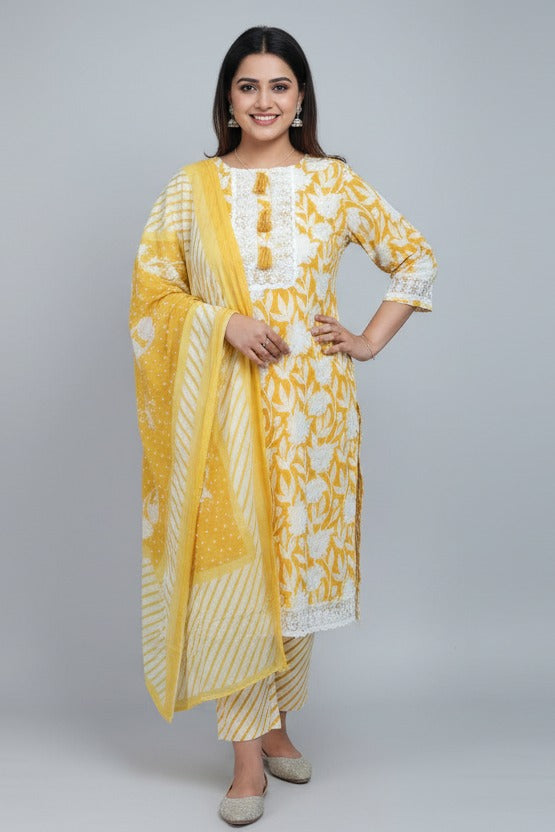 Elevate any special occasion with our exquisite Yellow Sapphire Cotton Suit Set, featuring detailed Lace embroidery, Lace detailing in kurta end, and decorative sophisticated print motifs. Complete with coordinated Cotton pants and Dupatta, this set is available in sizes M (38), L (40), XL (42), XXL (44). Crafted with premium cotton fabric of 60/60 thread count, ensuring a comfortable and durable experience with utmost finesse and beauty.